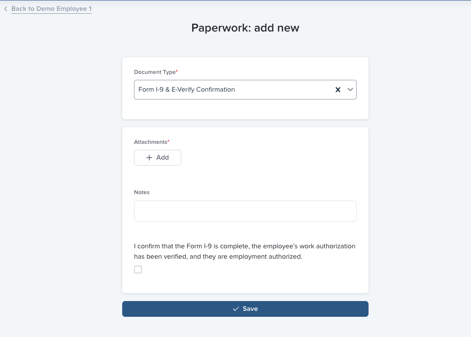 Once uploaded and saved, the employee’s I-9 status will be updated to Verification Complete.