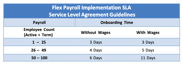 The Payroll Coordinator will ask that KithenSync and Client try to have everything over to Paychex at least 2 weeks prior to your first check date if you are in the 50-100 employees, 1 1/2 week if you are in the 26-49 employees, and 1 week if you fall into the 1-25 employees.